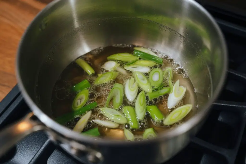 - In a small saucepan over low heat, combine neutral oil, scallions, and Sichuan peppercorns. Warm gently for 5 minutes, stirring, until scallions soften and oil is fragrant—do not let garlic burn.