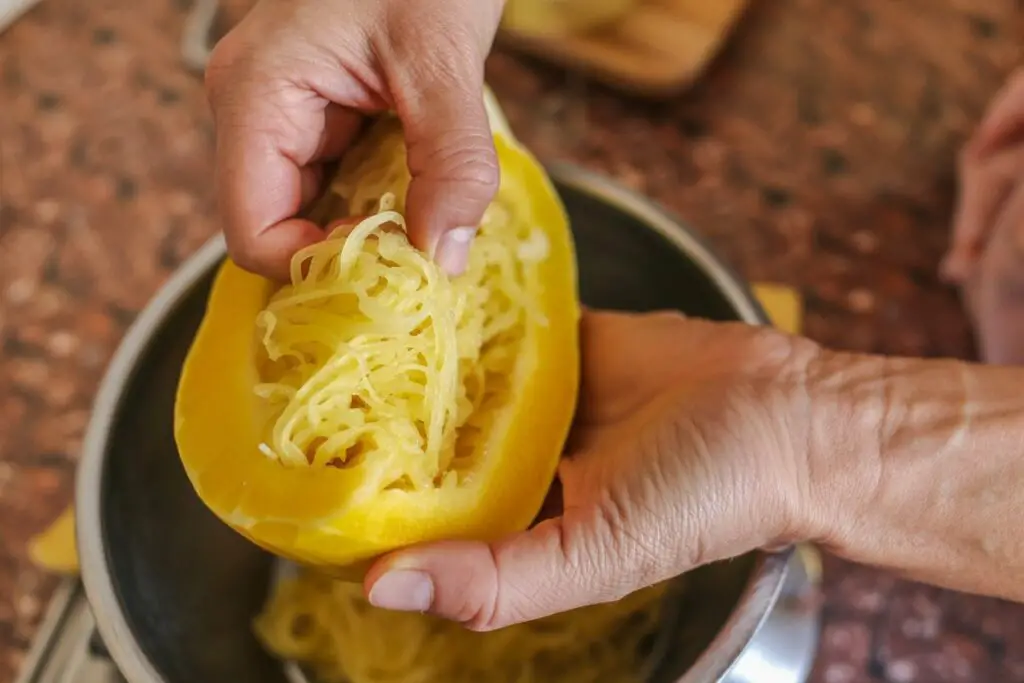 Preheat oven to 400°F (200°C). Halve squash, scoop out seeds, and place cut-side down on a parchment-lined baking sheet. Roast 30 minutes until strands easily separate with a fork. Let cool slightly, then scrape flesh into a large bowl, creating “noodles.”