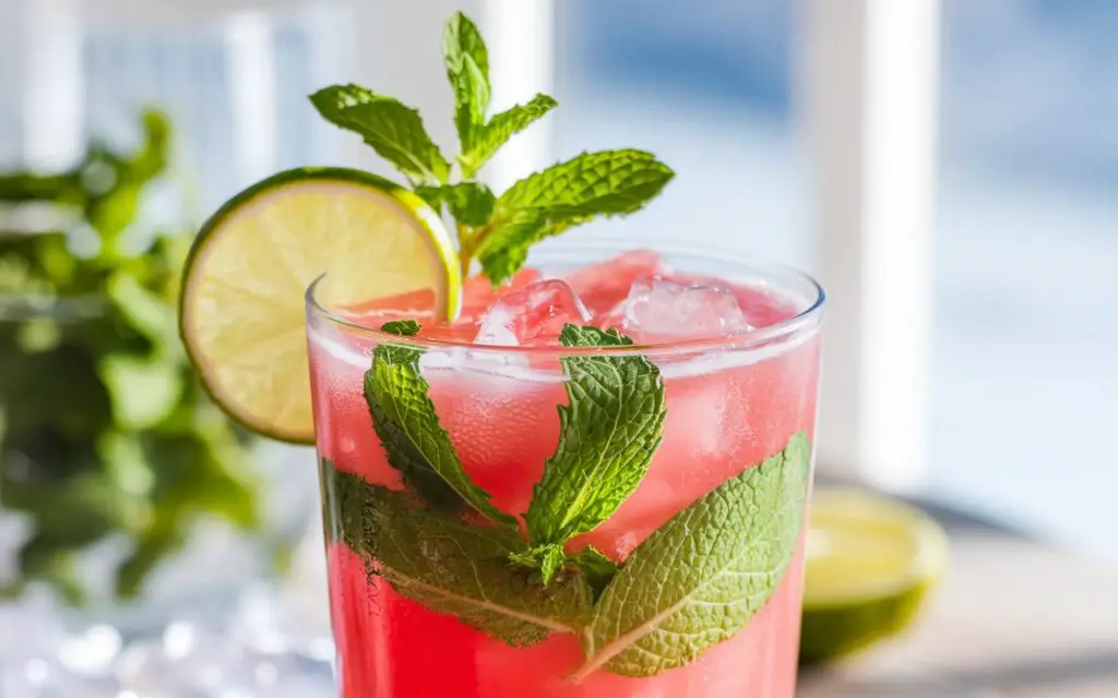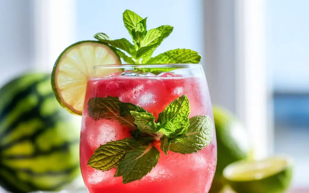 - Garnish: A mint sprig or watermelon wedge on the glass rim, plus a lime slice for color.
